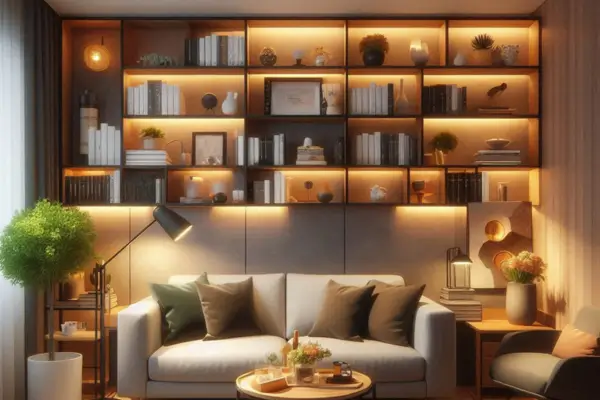 Uma dica que mudou meu apê: iluminação direcionada nos móveis embutidos. Coloquei umas luzinhas pequenas apontadas para minhas prateleiras e, além de destacar os objetos decorativos, ainda criou um ambiente super aconchegante à noite.